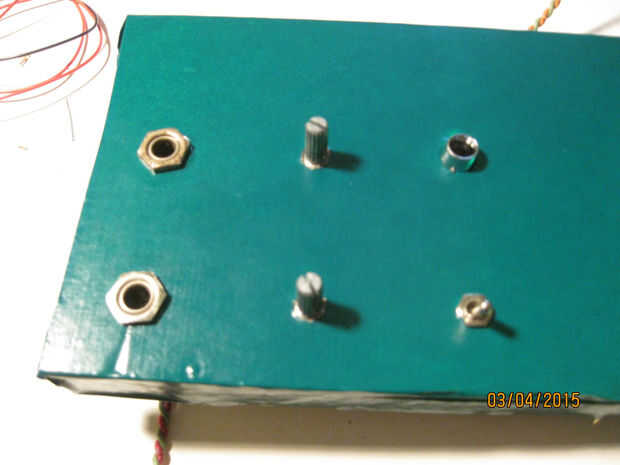 No que grande de un acuerdo ya que estaba planeando cubrir el panel entero con la película de muestra reflexiva de 3M, pero los agujeros todavía mostraría a través. Bueno, a pensar en algo. Había cubierto el panel con la película reflexiva e instalé el potes, jacks, interruptor y LED titular. Desafortunadamente, la luan era un poco demasiado espeso para las tuercas y arandelas para caber en los potes de volumen. Dejé sueltos para ahora hacer el cableado del circuito de amplificador más fácil.