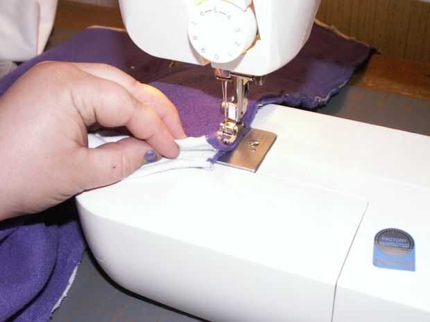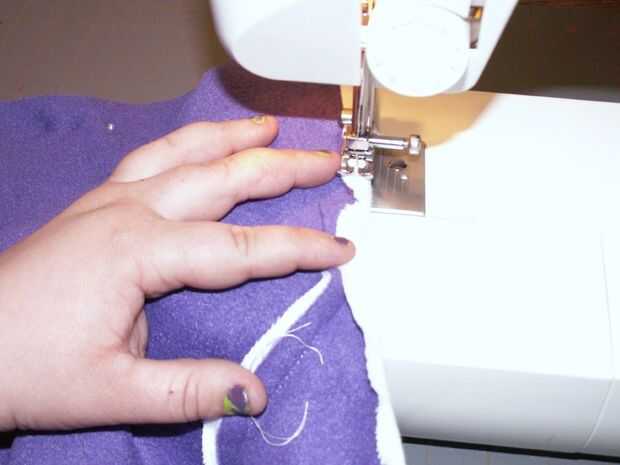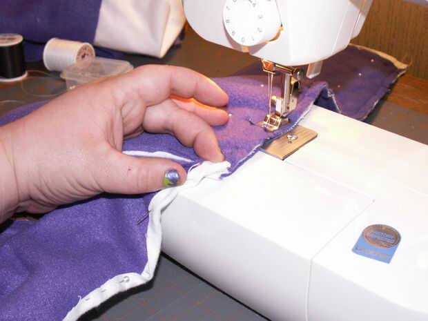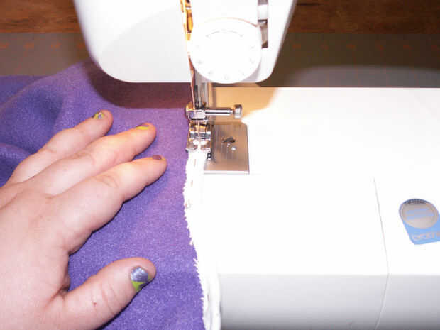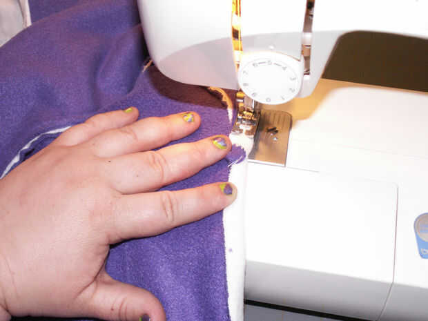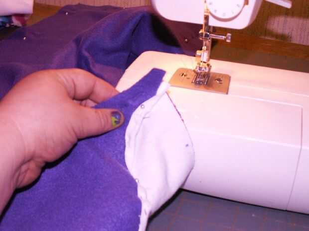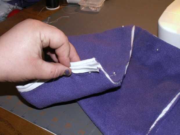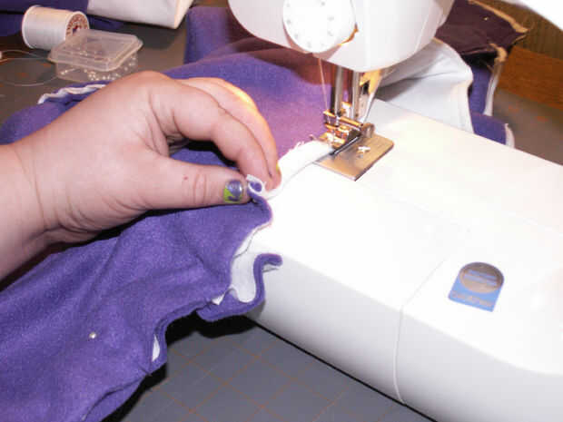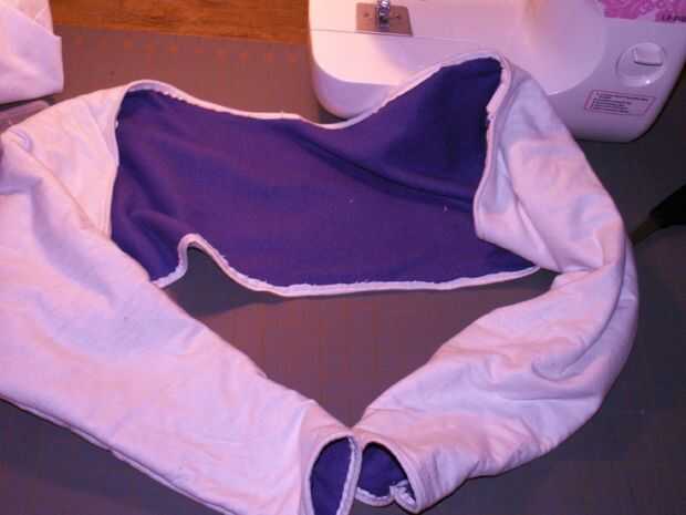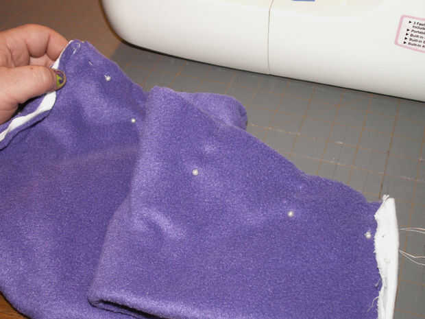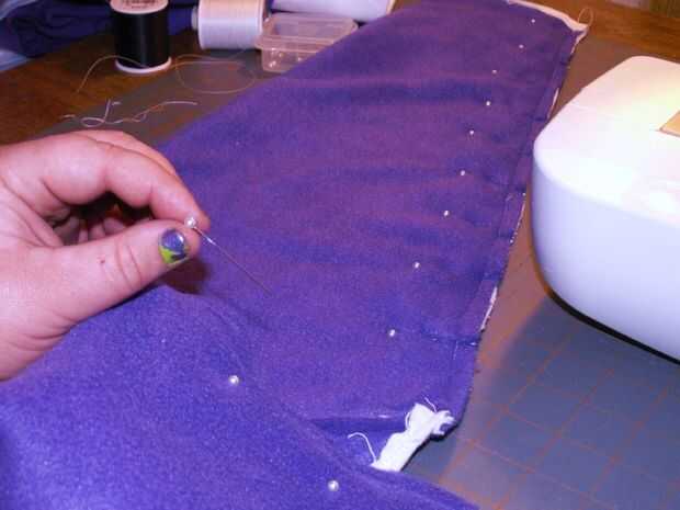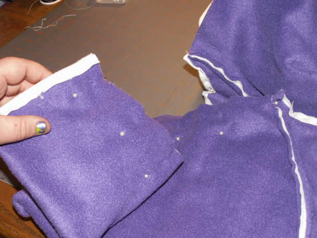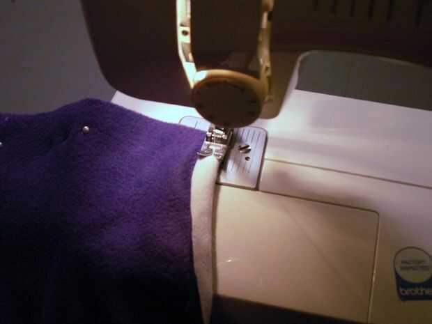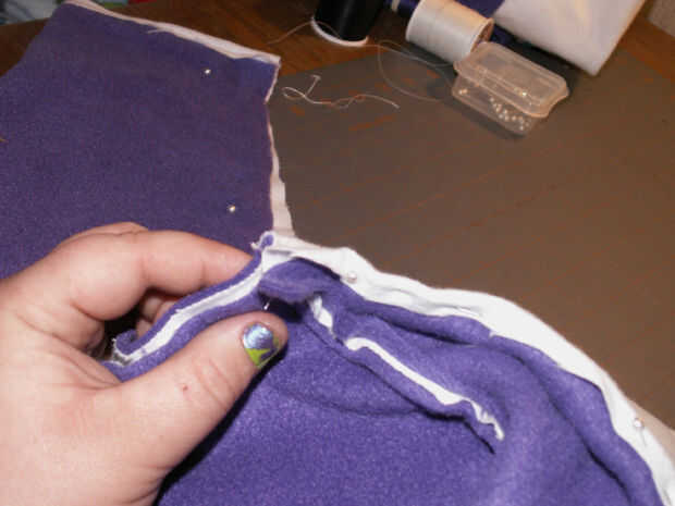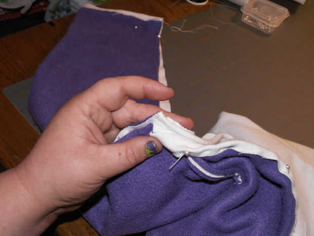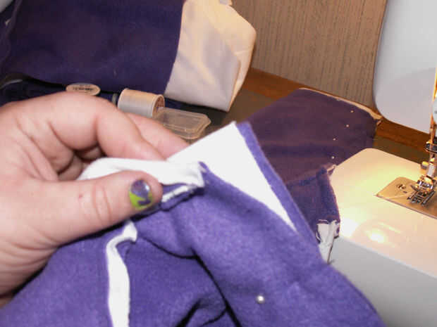 Retire todos sus pernos donde han cosido en el. Ahora, prender las mangas juntas donde va hacer su costura larga para bajar la longitud de los calentadores de brazo [imagen 9]. Repetir la fijación con la otra manga. Comenzar a coser en el extremo delgado en de las mangas y hacer una puntada continua a través de la parte inferior de la pieza posterior, donde franela ha sido doblada sobre el paño grueso y suave [imagen 11 y 13]. Al llegar al final de la espalda [imagen 14 y 15], parada, final la puntada y costura inicio el otro extremo delgado de la manga de frente hasta encontrarse con la pieza posterior otra vez donde usted terminó su última puntada.