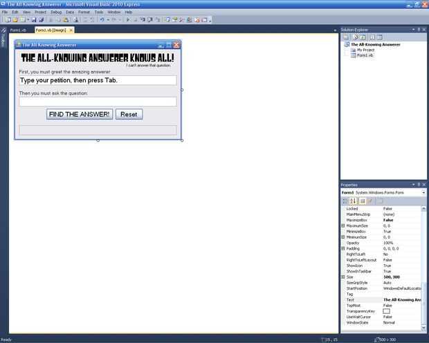 Ahora, antes de subir a escribir el código, agregue una etiqueta más y cambie su nombre a "astuto". Ponla donde quieras porque va a ser invisible. Establezca su propiedad Visible en False. Aunque se puede todavía ver ahora, no podrás cuando ejecute el programa. Establecer su propiedad Text a "No puedo contestar esa pregunta".