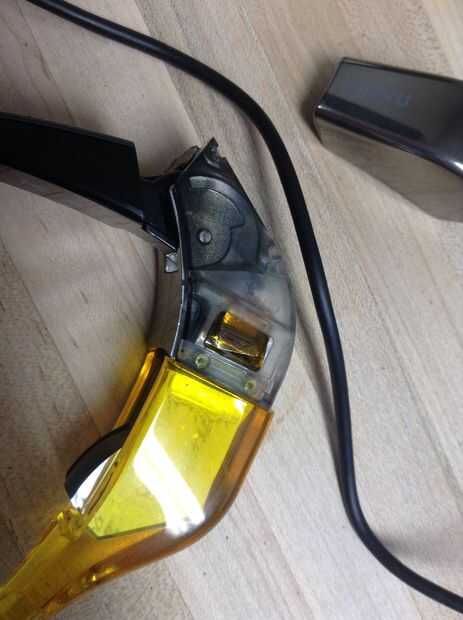 Por debajo de la parte de plata es una pieza de plástico, claro, que cubre los componentes internos. Lado el frente de eso, es un trozo de cinta, a lo largo de la costura. Que tire, y la parte transparente de plástico se puede apalancar aparte fácilmente. (Ver fotos)