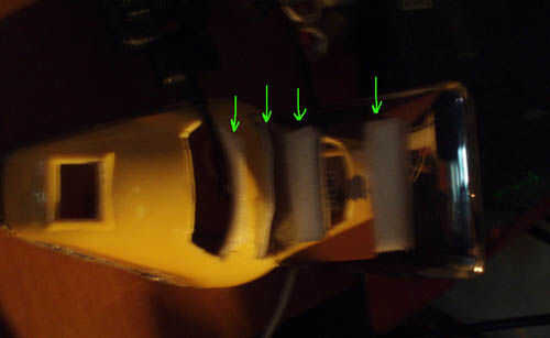 Pero la solución vino muy brillante en mi mente. Su muy simple. Lo haré como frenos algunos espuma plástica del personal de empaque. Así que usar un poco de espuma en el ipod en la base y en mi teléfono móvil. Cortar pedazos pequeños de él como 0, 5 cm x 1 cm y fije en la parte trasera (placa de cromo) de IPOD. No usar pegamento pero pequeños pedazos de doble acople cinta. Así, el cromo es limpio y más seguro para mantenerlo. También corté verry pequeñas líneas de este excelente material (espuma) y os adjunto por el pegamento en los bordes de los puntos de contacto del orificio en la unidad de carga. Este truco brillante proporciona estanqueidad, estabilidad, seguridad y diversión más segura con tu IPOD TOUCH
