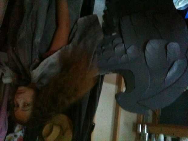 This is a static prop of a weeping angel based on a real monument design.  Es un cementerio popular monumento que queríamos duplicar.  El apoyo consiste en una base de madera recubierta en goma y un alambre de pollo y cuerpo de madera cubierto de hoj
