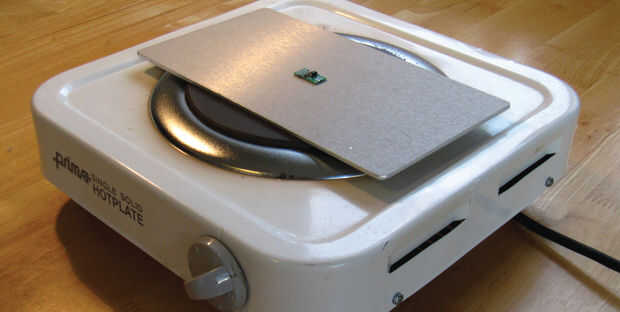Coloque la Junta en un plato caliente y preparación para soldar. También es una buena idea para colocar la Junta en una placa de aluminio si tienes uno. Esto no sólo hace más fácil moverse, pero también al final del proceso de reflujo puede recoger la placa con un par de pinzas y ponerla en otra parte a enfriar. Esto permitirá enfriar más rápido y evitar el sobrecalentamiento causado por la inercia térmica.