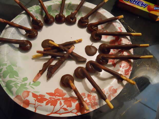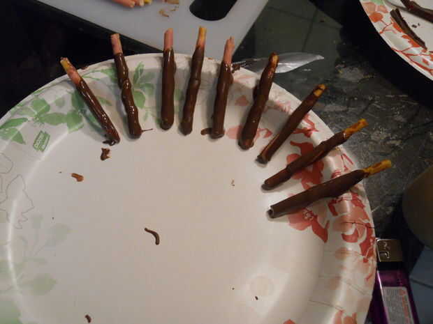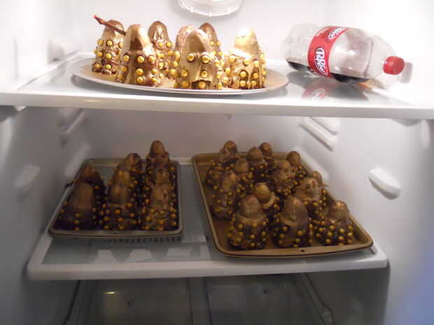 Habíamos intentado congelar regaliz de cordón rojo (sí, lo sé. Regaliz no es rojo. Pero eso es lo que llaman!) y capa de corteza de almendra pero no era lo suficientemente rígida. Así que nos fuimos con pocky (galletas recubiertos de caramelo palitos de Japón) para un brazo y oro trenzado velas para el otro. Palitos de pretzel pequeños habría sido nuestra tercera opción. Cortar el pocky en pedazos de tamaño de brazo, había sumergido en corteza de almendra y luego utiliza corteza más almendra para pegar en gotas de Hersheys. De los tallos del ojo utilizamos pequeños trozos de caramelo rojo cadena en lugar de gotas de hersheys. Transportados los Daleks sin sus brazos y agregó una vez que llegamos al destino!