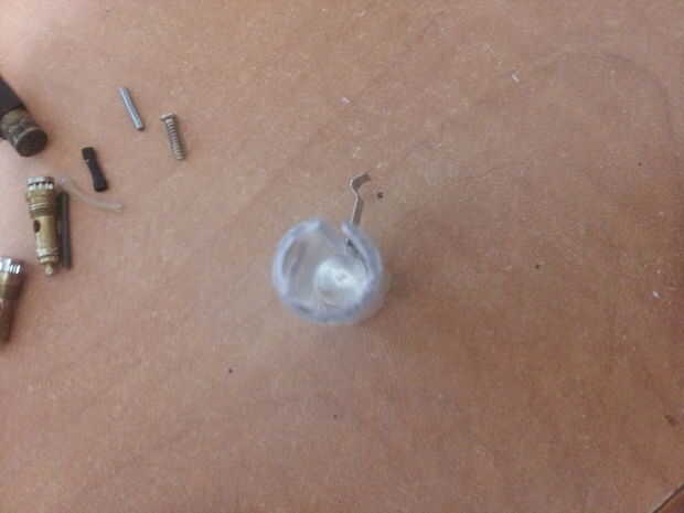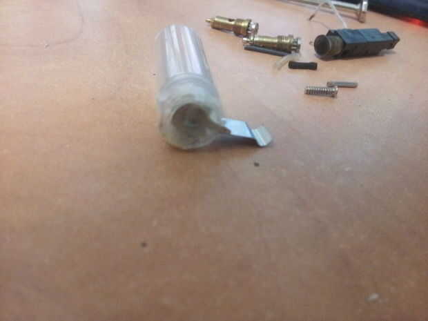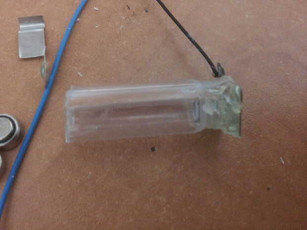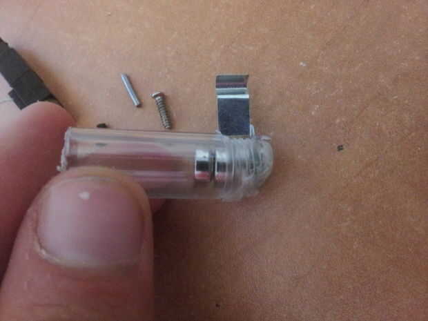 En la parte inferior del tubo plástico del pegamento la parte de la primavera, luego introduzca las pilas (partida positivo hacia abajo).