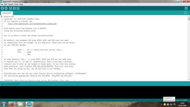 5) haga clic ahora en "bosquejo > subir". El IDE primero compilará el programa y después de eso willupload el sketchto su placa de Arduino. Después de que el bosquejo es subido, ahora tu arduino actuará como un programador AVR ISP(In system programming).