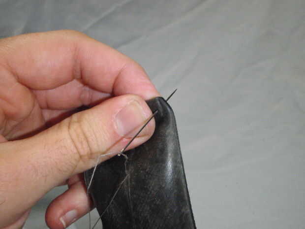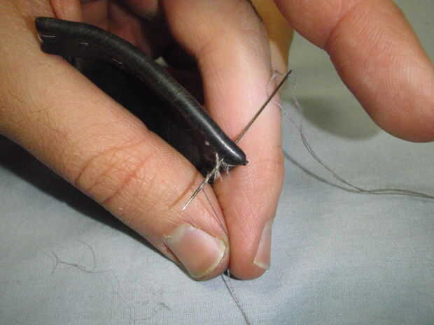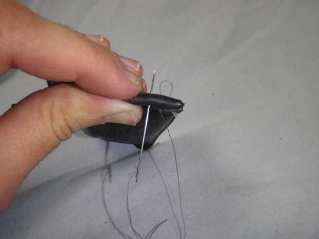 Comenzar a coser empujando la aguja a través del doblez como se ve en la primera foto. Esto puede ser un poco difícil así que mantened un dedal o doblado encima de papel; un par de alicates de la herramienta multiusos también vino práctico.