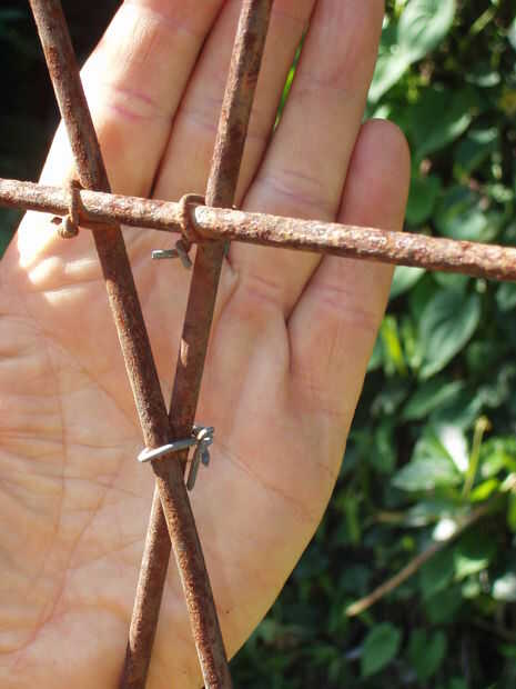 Cuando usted unir la varilla en las intersecciones, tienes la opción de o torcer los cables en sentido horario o antihorario. Una forma es generalmente mejor que el otro, dependiendo de cómo las varillas superponen. Si el cable no queda apretado, la articulación será floja. La dirección que activa es algo que tiene que decidir cada vez que giro, y es algo que tienen dificultades para explicar a la gente incluso en persona. ¡ Mucha suerte aprendiendo por su cuenta! Practicar y seguir pensando como vas.