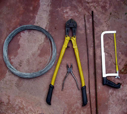 Yo uso sobre todo varillas de 1/4 de pulgada, pero varilla de 3/8 de pulgada también es útil, especialmente en el primero en establecer las grandes líneas. Doblar la varilla a mano es fácil. Alicates son necesarios solamente para curvas muy cerradas. 1/16 de pulgada galvanizado alambre del lazo del hierro se utiliza para atar todo junto.