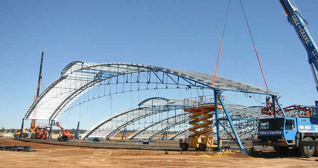 La técnica que utilizamos para lograr tales palmos se basó en un cable tensionado compuesto de varios hilos corriendo por los acordes de la parte inferior de las cerchas. Estos filamentos se destacaron mediante gatos hidráulicos y luego la totalidad del lote era bloqueado en su lugar rellenando los acordes con lechada de alta resistencia. El resultado fue un braguero de peso increíblemente rígido pero muy ligero. Ver la imagen de abajo de un techo para patios de venta de ganado por s-squared. 70m palmo claro.