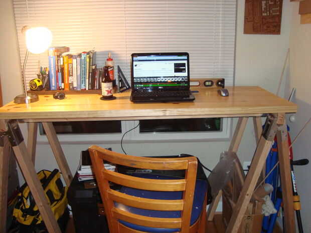 Esta es una fotografía del producto terminado. Es simple y extremadamente versátil. Utilizo este diario de escritorio para el trabajo, y si necesito los caballetes para trabajo real acabo de quitar la parte superior e ir a trabajar. Como se puede ver guardo mis herramientas en un cofre de trabajo que encaja perfectamente debajo de la mesa y realmente actúa como un resto del pie. Los libros a la izquierda están sentados en una pieza de caoba que había sobrado de un proyecto que hace un útil muy elevada. Espero ayuda y mucha suerte.