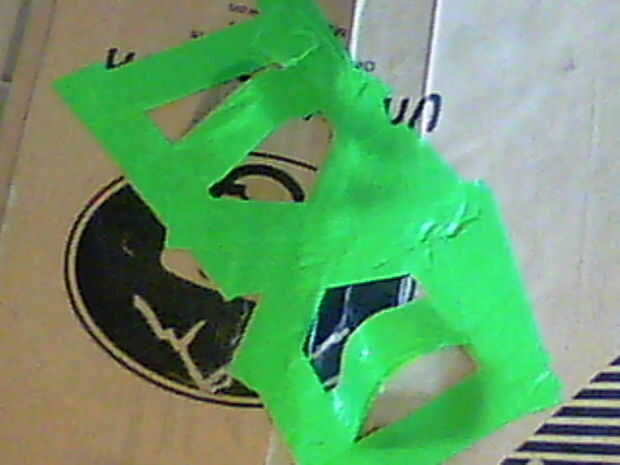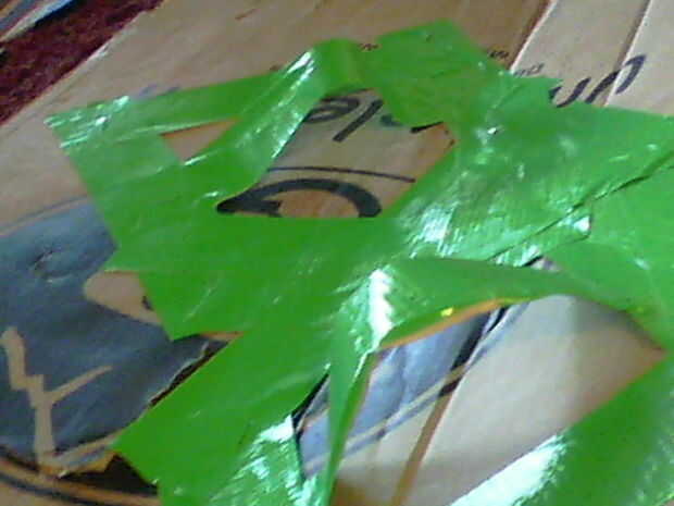Ahora salir de la cinta. vamos a hacer un mango para el escudo. Tome un pedazo de 6'' de largo y otra pieza de 7'' de largo. poner el lado de stickey juntos pedazos hacia adentro para que 6'' pieza esté centrado con el 7'' uno. Coloque esto en la parte posterior del escudo. Se trata de la primera palanca. hacer otro más abajo para que pueda poner su brazo por la parte inferior una y agarrar la grapa one.then superior hacia abajo y poner más cinta en los laterales como así para asegurarse de que la cinta no com para arriba. Puede que necesite más de la cinta y luego usé.