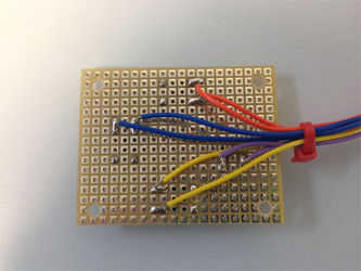 Los motores paso a paso no acumulan errores y por lo tanto el posicionamiento es muy preciso. El problema viene si hay una interrupción de energía. La tabla x-y 'sabe' Dónde está solamente concerniente a donde empieza, por lo que si el poder se apaga, va a pensar 'casa' es donde despertó. Pasamos un pensamiento de largo plazo de maneras de lidiar con esto. Una posibilidad era añadir sensores de contacto para permitir que la tabla calibrar a sí mismo a una posición fija. También podríamos haber añadido escritor tarjeta de memoria flash para llevar un registro de la posición segura si había una energía hacia fuera. Al final nos fuimos para una solución de baja tecnología. Hemos hecho un simple D-pad de 4 botones momentáneos. Cada bucle, el código parece para ver si estos han sido presionado y entonces unidades de la tabla en la correspondiente dirección. El D-pad es un simple pedazo de perf board con los botones de soldado en (la imagen muestra la parte de atrás). La longitud de los cables de conexión le permite ser escondido en el caso de cuando no es necesario. Esto funcionó muy bien y nos ha permitido alinear fácilmente la primera muestra con el LED cuando nos estábamos preparando.