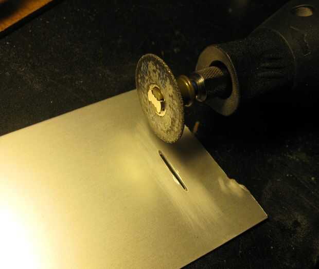 Hacer una pequeña ranura en una pieza de metal o de cartón. (He utilizado el accesorio de rueda pulido de mi fiel Dremel 4000)