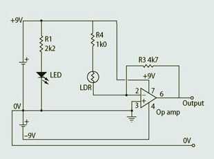 Montar el amplificador según el circuito. Usé un opamp TL081. Luego Mida la tensión entre 0V y la salida; esto variará dependiendo de la luz que incide sobre la LDR.