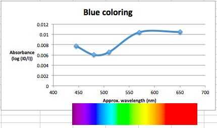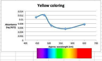 Está claro que el tinte amarillo no absorbe mucha luz en la región de longitud de onda verde/amarillo. El tinte azul parece absorber nada sino azul, y el tinte del verde tiene una afinidad para la luz azul y roja, dejando que pase de verde a través de.