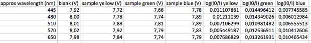 Como una primera prueba, decidí medir algunas muestras de colorante y azul de metileno. No tengo un montón de puntos de datos porque el motor paso a paso que estoy usando da pasos más grandes, resultando en saltos de longitud de onda bastante grandes.