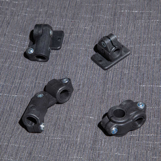 Los más caros y más difíciles de encontrar las piezas son las pinzas. Usar abrazaderas luz RK (sitio web del fabricante) que compré a un vendedor local. Son de plástico, también puede obtener las abrazaderas del metal pero no necesita la fuerza adicional. Estoy usando cuatro diferentes tipos de abrazaderas, abrazadera cruzada, brida abrazadera, abrazadera de base con una articulación ajustable y T-clamp también con una junta.
