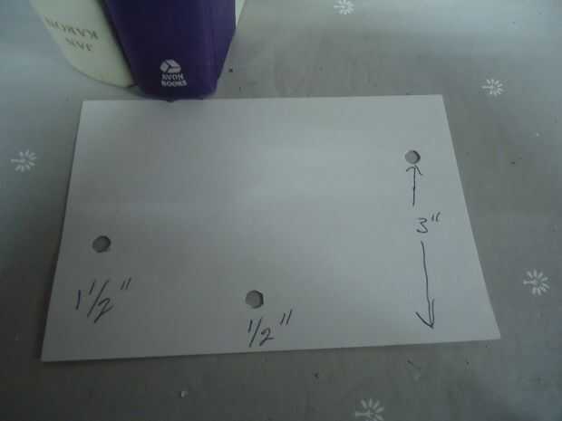 3. las marcas en la tarjeta que se muestra son 1-1/2 "X 1/2" X 3" de la parte inferior de la tarjeta de índice de 4" X 6". Las dos marcas exteriores están a unos 3/4" en el borde de la tarjeta de la marca media un poco del centro hacia la marca 1-1/2" como se muestra en la imagen.