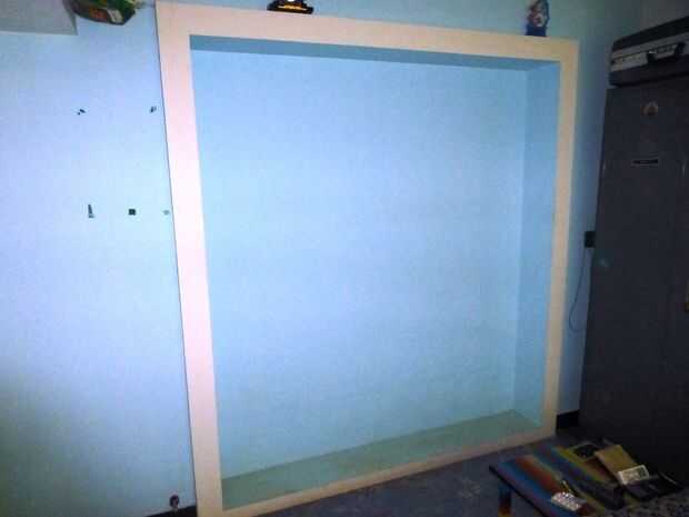 El interior de la hendidura son 6-1/2 pies x 6-1/2 pies con una profundidad de aproximadamente 9 pulgadas dentro de la pared. Planeamos hacer un estante con tres verticales y cinco horizontales particiones dividiendo igualmente el espacio disponible. La profundidad aumentará a 12 pulgadas mediante la proyección de la plataforma fuera del borde de la pared existente. También planeamos usar fibra de densidad media (MDF) para la estantería que es duradero, peso ligero, fácil de trabajar y más barato.