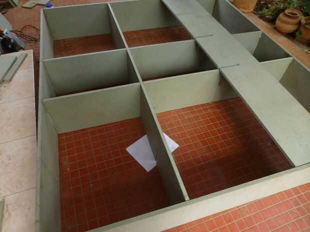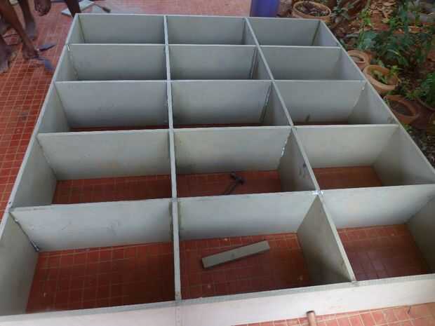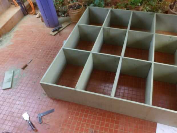 • Ajustar el alineamiento con la escuadra de carpintero y fijar todas las tarjetas en la caja externa con clavos y adhesivo de resina sintética.