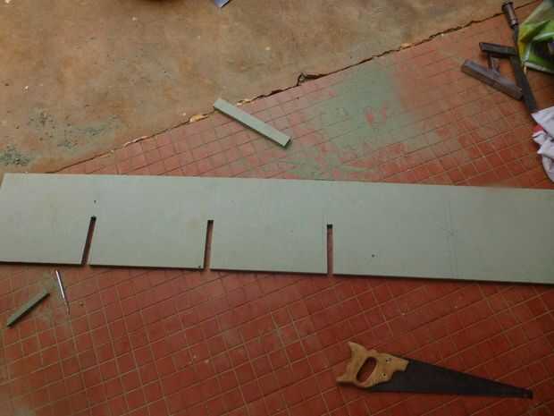 • Las tablas se dividen en cinco partes igualmente. También puede colocar las tarjetas en las ranuras que hicimos en las juntas horizontales y marque la posición de los surcos para hacer.