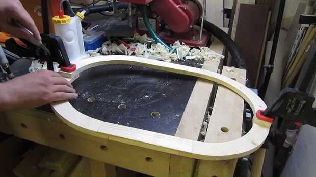 La base de esta bandeja son dos marcos ovalados. Una trasera y una frontal. Cada uno está hecho de 6 piezas y junta con juntas de regazo medio simple.