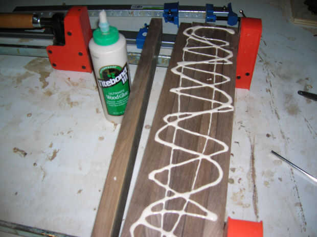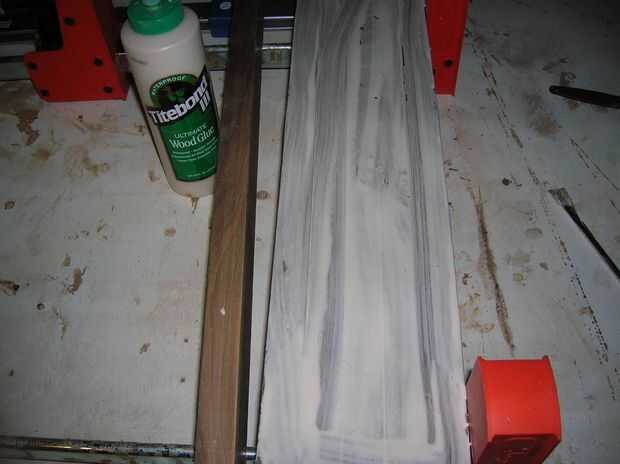 Ahora es el momento para pegar estos juntos. En la tabla de pegamento me colocar las abrazaderas y las juntas del tirón. Aplicar pegamento a todos los bordes al mismo tiempo. Una vez finalizado extienda el pegamento uniformemente con un pincel de silicona. Un cepillo hilvanado en su sección de utensilios de cocina de especieros funciona muy bien para esto. Ya que es una tabla de cortar, estoy usando un pegamento impermeable que es FDA aprobada para contacto con alimentos.