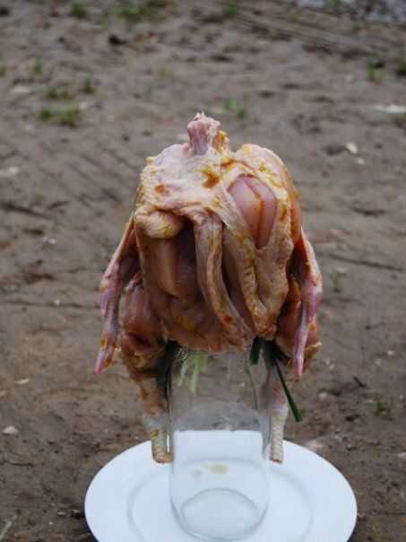 Ahora llene una botella de cerveza vacía en la cavidad del pollo y colocar en un plato (esto recogerá una deliciosa salsa)