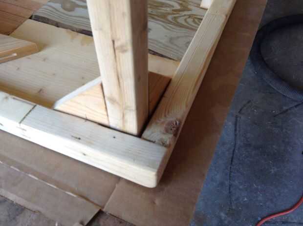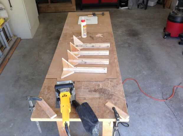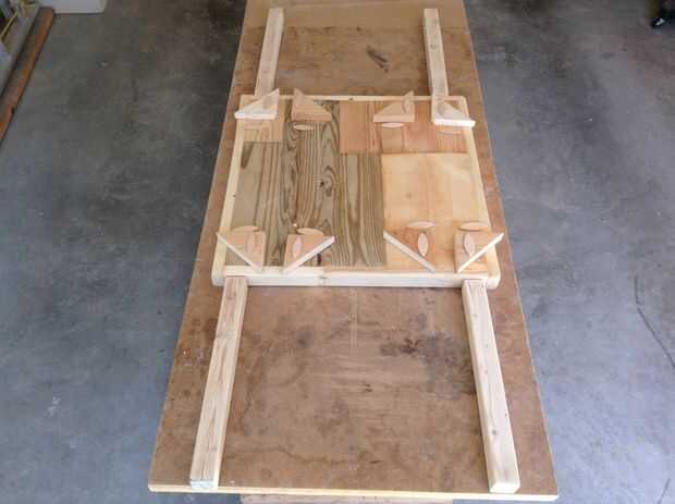 Yo agonizaba cómo hacer que las piernas fuertes para la tabla y decidí Utilice abrazaderas para sujetar las piernas. Los refuerzos triangulares se pegan a las piernas mediante la técnica de unión de placa. Primero, corté las piernas a la longitud. Entonces puso las piernas hacia fuera y elegir las mejores piezas para exposición al exterior y marcan de la madera donde las piezas triangulares fueron a por las galletas. Se puede ver en las fotos, que puse todo como estaba para ser ensamblada. Cada canal galleta fue marcada y numerada, por lo que no sería duda más tarde cuando consiguieran mezcladas cosas. Después sujetó los refuerzos triangulares a las piernas, dejo que el pegamento seque durante la noche. Entonces, hice los cortes galleta en las partes inferiores de los tirantes y la propia mesa. Ajusté la ensambladora para cortar los canales exactamente en el centro de 1 x 4 refuerzos triangulares. Esta manera, todo encajaría, no importa cómo cortar los canales en la parte inferior de la tabla. Una vez más, todo lo que necesita marcarse cuidadosamente, para que sepa exactamente donde se encajan las galletas. No encontré alguna forma fácil de sujetar todo juntos, así que dependía de la gravedad y sólo empujó todas las galletas en su lugar en las llaves y luego empujado esa Asamblea en la mesa y dejar que seque de esa manera durante la noche. Cuenta que no todo es perfecto exactamente, y no todo es 90 grados. Es la parte de"carácter". La belleza de la imperfección!