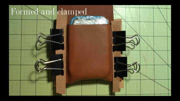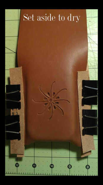 - Tomar algunos retazos de cuero o algo suave pero firme y coloque a lo largo de los bordes para que las abrazaderas de papel no marcan tu piel. Sujetar todo en su lugar y dejar de lado que se seque. Después que ha comenzado a secarse para arriba un poco me quite las abrazaderas pero deje la bandeja dentro. Hago esto porque puedo suavizar algunas de las marcas que pueden hacer que las pinzas, pero el caso ya ha formado suficientemente que probablemente no perder cualquiera de su forma. Hasta que se seque totalmente ser muy cuidadoso con él porque todo contacto con la piel ligeramente húmeda puede conducir a las marcas en la piel.