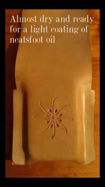 - Deje que la piel completamente seca, aproximadamente 8-12 horas y luego utilizar un trapo para aplicar una capa muy ligera de aceite del neatsfoot al lado liso de la piel. Permitir que repose durante una hora o dos (más es mejor).