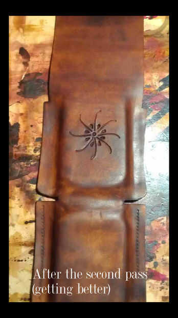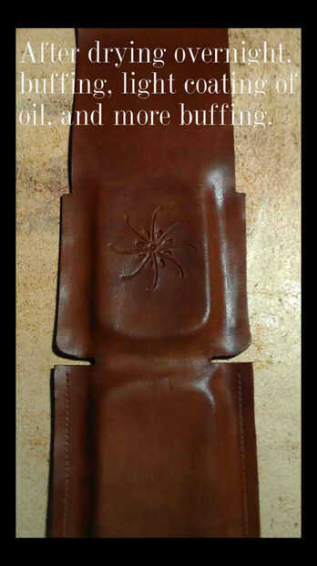 Deje que se seque durante la noche. Me aplique otra capa delgada de aceite del neatsfoot (siempre sobre el lado liso de la piel) y pulir más. El aceite del neatsfoot ayuda a suavizar el cuero e hidratan igual se usa loción en su piel después de estar en la piscina pública (o algo por el estilo). El tinte reseca la piel por lo que su piel se lo agradeceran. :)