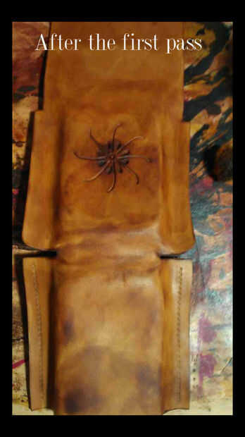 - Ir en un movimiento circular y tratar de mantener constante la cantidad de tinte que se aplica. Que este se siente durante una hora o así en remojo. Algunas personas no teñen el interior pero me gustaría poner una capa en el interior. Sólo tenga cuidado porque con este fino cuero sangrará a través al otro lado si se aplica demasiado.