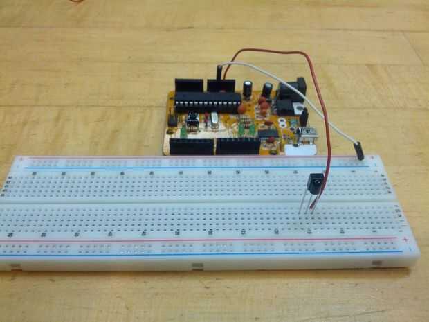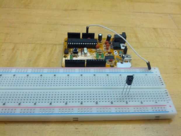 4.) Conecte uno de los cables cortos de la zona mundial de la tierra en el protoboard al Pin central del receptor IR.
