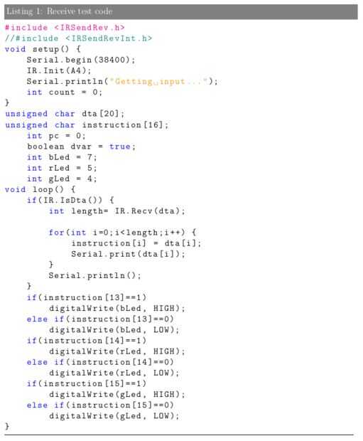 El código receptor esencialmente se convierte en el receptor de infrarrojos y después escucha para la entrada. Una vez que se ha recibido algún tipo de entrada IR, entonces toma estos datos, que es una cadena de caracteres en este ejemplo y ejecuta una instrucción (encender o apagar un LED) dependiendo de la instrucción que le fue enviada. En este sistema, los tres últimos 'bits' representan que condujo para encender y para apagar. Si el bit es 1, entonces se enciende el LED correspondiente y de es 0, entonces ese LED se apaga. Si fueras a agregar más nodos a su sistema, sería necesario a cada dispositivo para determinar si la instrucción que recibieron fue realmente para él, que pudiera ser implementado mediante la consulta para un control 'bit' antes de ejecutar la instrucción de código.
