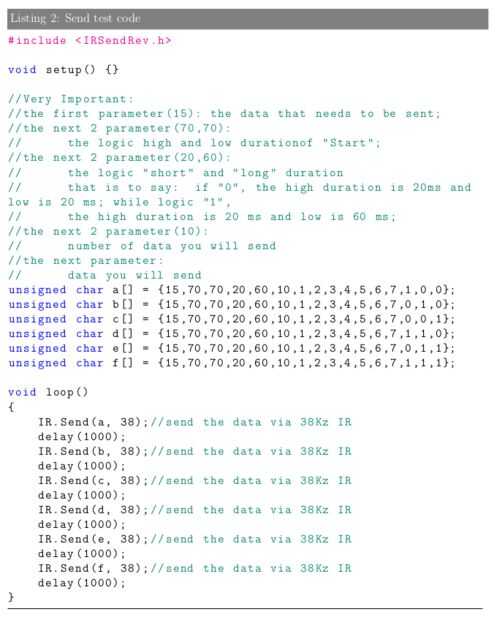 El código emisor hace un par de cosas diferentes. Primero establece algunas de las variables, la más importante es las instrucciones para el dispositivo, con la etiqueta 'a' a 'f' y es matrices de caracteres. Estas funciones de matrices como las instrucciones de la CPU para algo como una CPU de Hack, aunque mucho se simplifica; el primero de varios de los números en estas instrucciones son necesarias para la determinación de la especificación de la señal de IR a enviar y no son esenciales para entender el sistema en sí. El más importante de los 'bits' de la instrucción son los tres últimos, que determinan que el LED esté encendido (o apagado). Estos son los caballos de batalla de nuestro conjunto de instrucciones muy pequeño, y es importante tener en cuenta que información más significativa podría ser enviado y actuó. Imaginamos que si construyen algunas infraestructuras, entonces usted podría enviar cosas como cuadros u objetos de clases que creó que podrían ser utilizados como entrada en su receptor nodos o conjuntos de instrucciones más complicadas que podrían imitar algo más parecido a un ordenador o CPU.