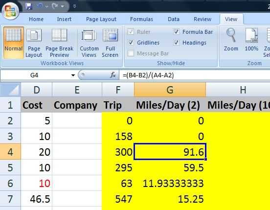 La razón de las dos columnas diferentes de Miles al día es un problema de resolución. Puesto que los datos están en una tabla, necesitan las fórmulas para determinar la pendiente de kilometraje en función del tiempo, más que el derivado de la actual. A veces voy en viajes largos y tiene que conseguir gas más de una vez al día, dos conjuntos de datos para la misma fecha de grabación. ¿Para le gente de matemáticas, recordar lo que sucede cuando hay dos valores de Y para un valor de X? Sí, vertical líneas con pendiente infinita. Malas noticias. (2) representa la pendiente en dos células. (10) representa la vertiente más de 10 células. Esto es algo así como conseguir diferentes resoluciones en sus datos. La fórmula MPG es lo es por mucho el mismo problema, ya que MPG es calculada a partir de datos incompletos. Para calcular el verdadero MPG tienes que ejecutar totalmente su tanque de gas vacío cada vez y averiguar exactamente cuánto gas quemó. Con su conjunto de datos hay un poco superpuestas, por lo que es necesario alisar para obtener datos útiles. Es por ello que la fórmula MPG utiliza 10 puntos de datos.