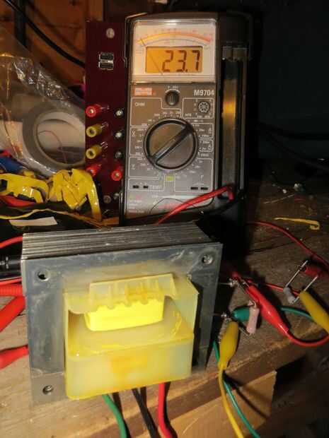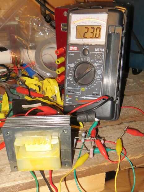 Puedes ver en las dos fotos, 23,7 voltios, que era la salida sin carga, y 23 voltios, que es la salida con una carga de prueba. Realmente podría hacer con ser un voltio más alto, así que agregaré en otro 4 vueltas, haciendo 108 vueltas por bobina.