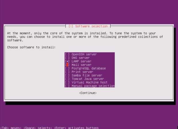 Nota: Para seleccionar un artículo haga clic en la barra de espacio, no oprimir la tecla ENTER. Golpear a entrar antes de la barra de espacio no se seleccione cualquier elemento a instalar. Una vez que el cuadro ([]) al lado de los artículos que se desean instalar se llena con una estrella (*), que puede golpear entrar. El objetivo de este tutorial es configurar un servidor con una base de datos y es por qué hemos seleccionado servidor LAMP. La lámpara está parada para Linux, Apache, MySQL y PHP. Estos son los cuatro elementos necesarios para una base de datos.