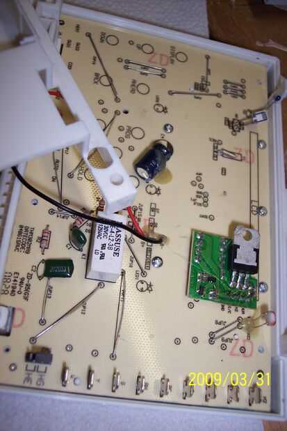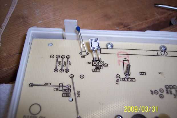 2. Desmontar el termostato. Retire los sensores y los cables de la soldadura. Taladre un orificio adicional en la placa "tierra" para conectar el alambre del dren del cable sensor. Excepto el sensor para el sensor de la placa en el paso siguiente.