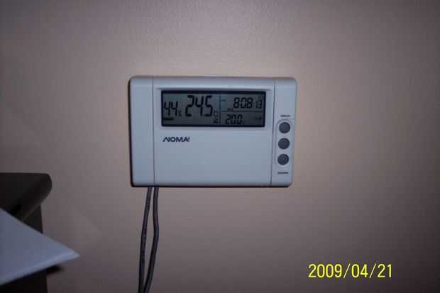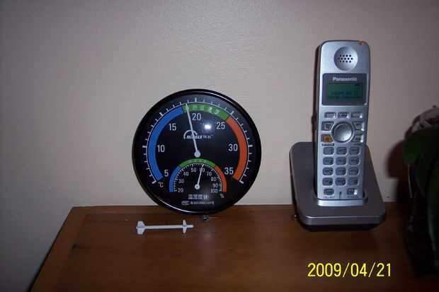 Hoy llueve. Mi termómetro de habitación muestra 60% de humedad. Enchufe en el sistema, y aquí usted 45% en el lado! (con 4 ~ aumento de 5 grados C) el ciclo es aproximadamente de 1:4 (23s en / 96s apagado), manteniendo la humedad entre 44% y 45%.