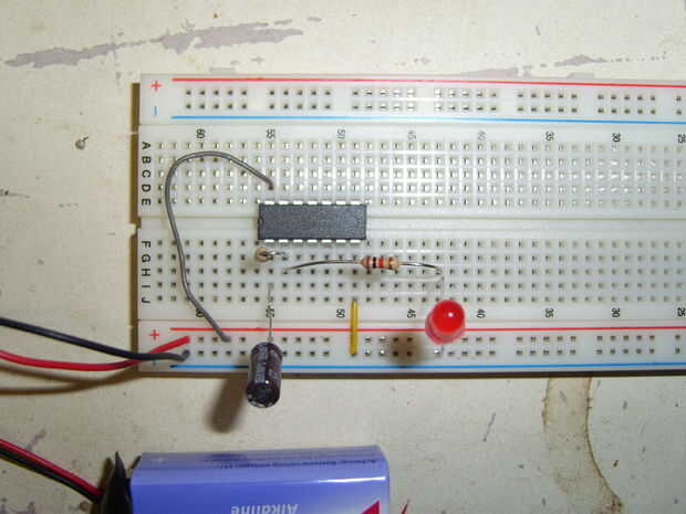 Ahora conectar el condensador al pin 1 y el suelo (atentos a la dirección, hay un menos impreso en la tapa - que el plomo va al suelo). Colocar un resistor de 100k - 200k entre el pin 1 y 2 de la viruta. Usted deberá agregar el resistor serie (1-3k) entre el pin 2 y el LED. Atentos a la dirección correcta del LED. La pierna más corta va a la tierra.