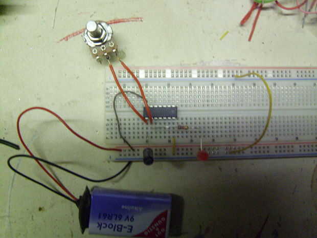 Así que con la resistencia grande (100k - 200k) puede cambiar la frecuencia de pestañeo. Desarrollan una resistencia menor, puede ver el LED parpadea más rápido. Cuanto menor sea la resistencia, cuanto mayor sea la frecuencia. También puede cambiar frecuencia cambiando el condensador de la misma manera.