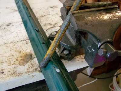 También había redondeado el extremo de la barra de refuerzo para caber el contorno del poste de la cerca. Soldó con autógena el extremo de la barra de refuerzo para el poste de la cerca. Aunque hay poco de pintura en poste de la cerca, mi soldador de núcleo de fundente cavado a través de él. Si había estado utilizando un soldador MIG, yo habría necesitado quitar la pintura donde la estaba soldadura.
