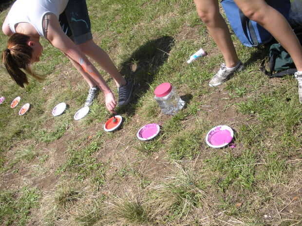 Encuentra un amplio espacio abierto donde la guerra de pintura podría llevarse a cabo. Si vas a hacer esto en la naturaleza, asegúrese de que las personas son cuidadosos con sus pinturas y lanzan a la gente, no en el suelo. Cuando nos fuimos había muy poca pintura en el suelo. Lo que hice fue configurar un montón de bolas de papel en el suelo en una línea y cerca de la mitad del tubo de pintura vertida en cada recipiente, luego vierte un poco de agua en el recipiente y mezclar para hacer una mezcla pegajosa pero no demasiado pegajosa. Para ahorrar aún más dinero, podría llenar el resto de la botella de pintura (todavía habrá alguna pintura en la botella) con agua, agitar para arriba y hacer una pintura de agua para arrojar a chorros el uno al otro.