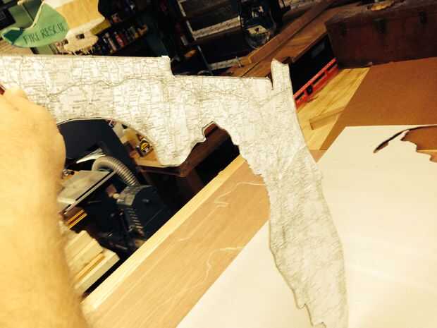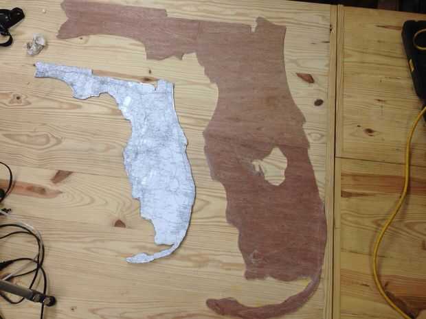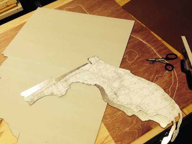 3. recortar el papel sobrante para el contorno de la Florida. No recorte todas las áreas de agua porque algunos le dará soporte a la madera más adelante.