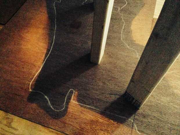 7. montar un foco sobre un trípode de cámara. Ajustar la altura para obtener una buena sombra (da vuelta a la ayuda de luces). Trazar el contorno de la sombra con tiza en los paneles de madera contrachapada. Ajustar la luz alrededor de la plantilla mantiene la misma altura hasta que el contorno es completo.