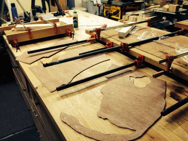 Durante este paso se preparó del cedro rojo. Los bordes de la Junta fueron cuadrados para arriba y corte a la longitud. Antes de empezar su cola-para arriba Asegúrese de que han cortado el número correcto de tablas. Colocar las tablas en el modelo que vaya a utilizar cuando se pegan juntos. Utilice la plantilla de madera contrachapada para comprobarlo. Galletas se añadieron a los bordes del tablero para la fuerza. Aplique el pegamento a las galletas y los bordes de la Junta y en las abrazaderas durante 24 horas. Las abrazaderas fueron usado superior e inferior. Varios 2 X 4 fueron utilizados para ayudar a mantener las juntas planas. Después de que las juntas se liberan de las pinzas marca el lado que deseas estar frente y al centro.