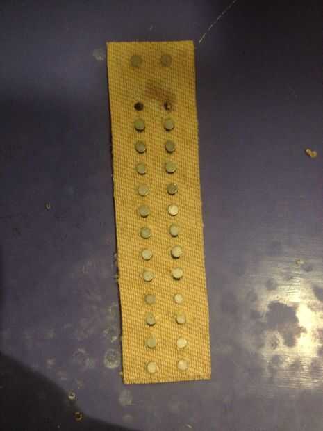 Recomiendo que aplicar cinta de doble cara a una de las tiras de tela en blanco y luego poner a la tela con los agujeros en él. Empuje los imanes a través de los agujeros en la cinta. Mira la fotografía para ver la orientación del imán. Luego ponga más doble cara cinta sobre los imanes y la tela con los agujeros en él. Por último, poner en la última pieza de la tela. La razón para el uso de cinta en lugar de pegamento es que el pegamento la tela blanca, que se ve feo y hace la tela mucho más rígido.